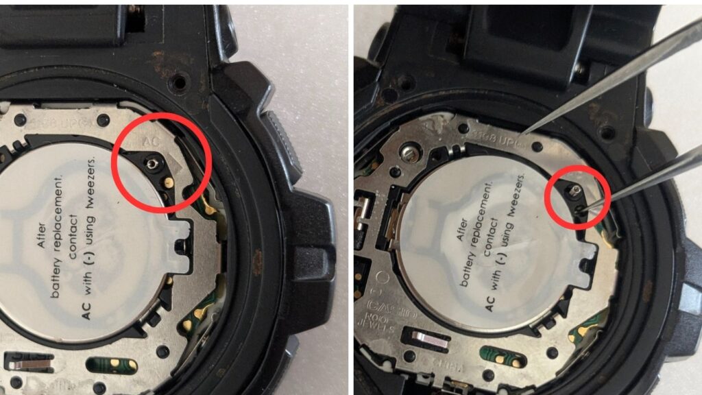 ピンセットの先で、『AC』と書いている矢印をたどった先と、銀色部分のどこかを同時に接触させます。